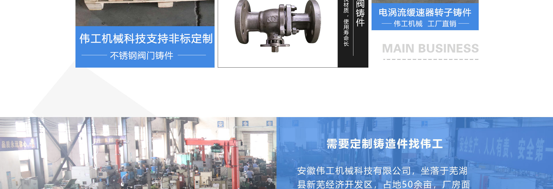 安徽偉工機(jī)械科技有限公司,坐落于安徽蕪湖新蕪經(jīng)濟(jì)開(kāi)發(fā)區(qū),是一家専業(yè)從事鑄造產(chǎn)品設(shè)計(jì)、研發(fā)、生產(chǎn)、銷(xiāo)售于一體的企業(yè),公司為客戶(hù)的產(chǎn)品提供多樣的技術(shù)支持與設(shè)計(jì),公司主要鑄造技術(shù)有潮模砂鑄造、硅溶膠精鑄工藝。主要產(chǎn)品有:不銹鋼閥門(mén)配件、泵閥配件、汽車(chē)配件、工業(yè)管道配件、工程機(jī)械配件、汽車(chē)配件等。材質(zhì)為:低合金鋼、304、316、316L、鉻鉬鋼、哈氏合金、碳鋼、雙相鋼等。公司已先后通過(guò)ISO9001和TS16949等多種體系審核,以完備的管理手段和齊全的檢測(cè)設(shè)備滿(mǎn)足客戶(hù)需求,進(jìn)的設(shè)備,専業(yè)的技術(shù),嚴(yán)謹(jǐn)?shù)墓芾恚€(wěn)定的質(zhì)量。服務(wù)客戶(hù),鑄造未來(lái),偉工誠(chéng)摯的歡迎新老客戶(hù)共同商洽合作